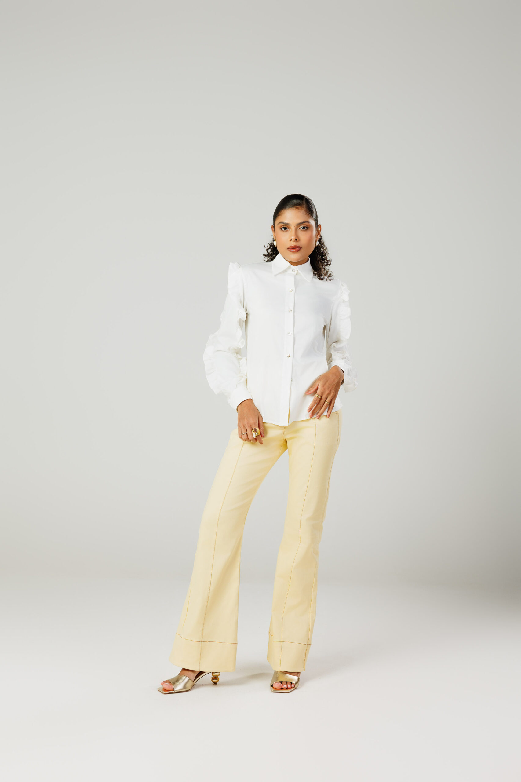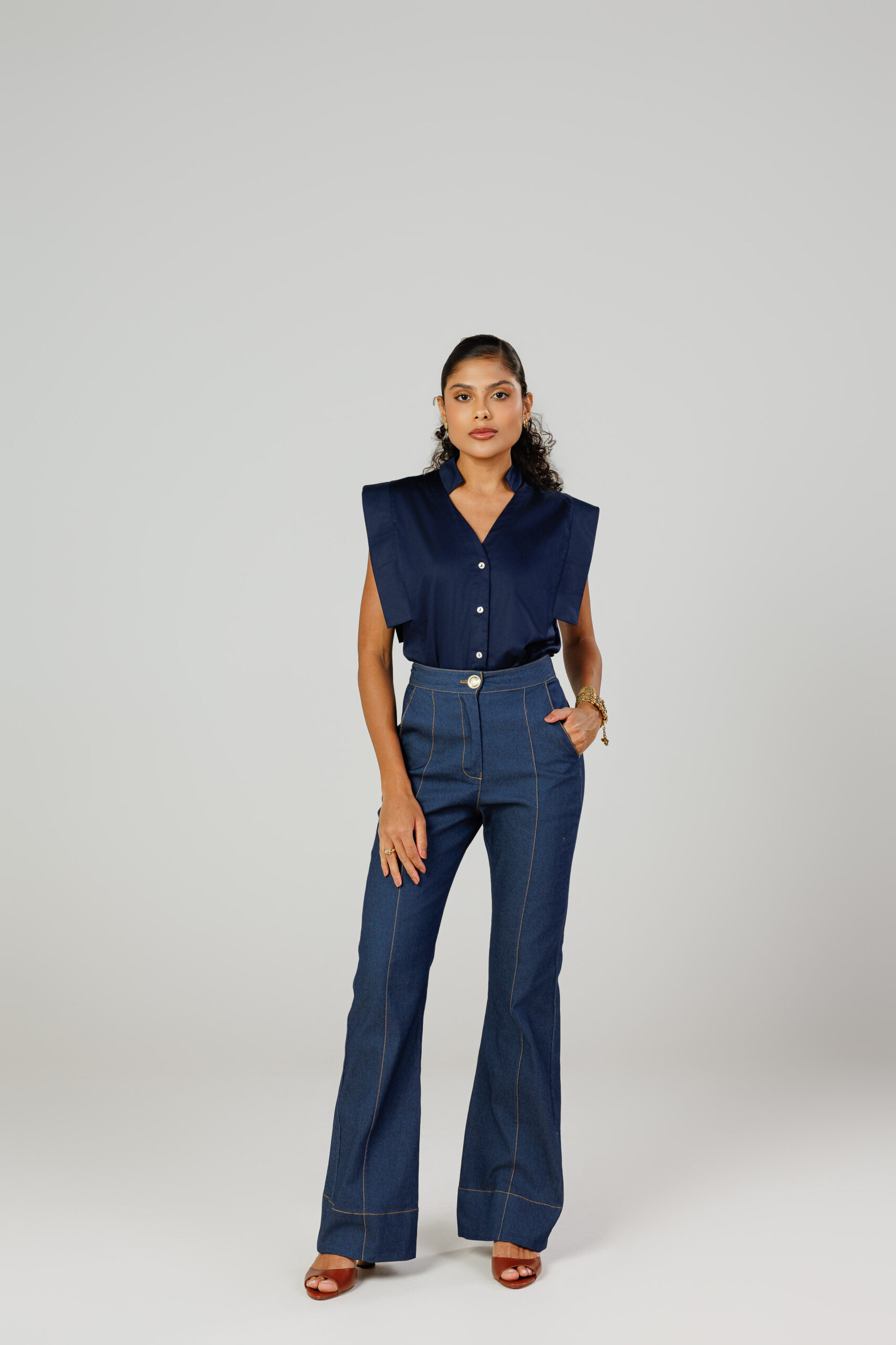 CALÇA HELENA, flare de cintura média com five pockets. Feita em sarja de algodão com elastano (Cotton Twill Color). Possui passantes e pespontos contrastantes.