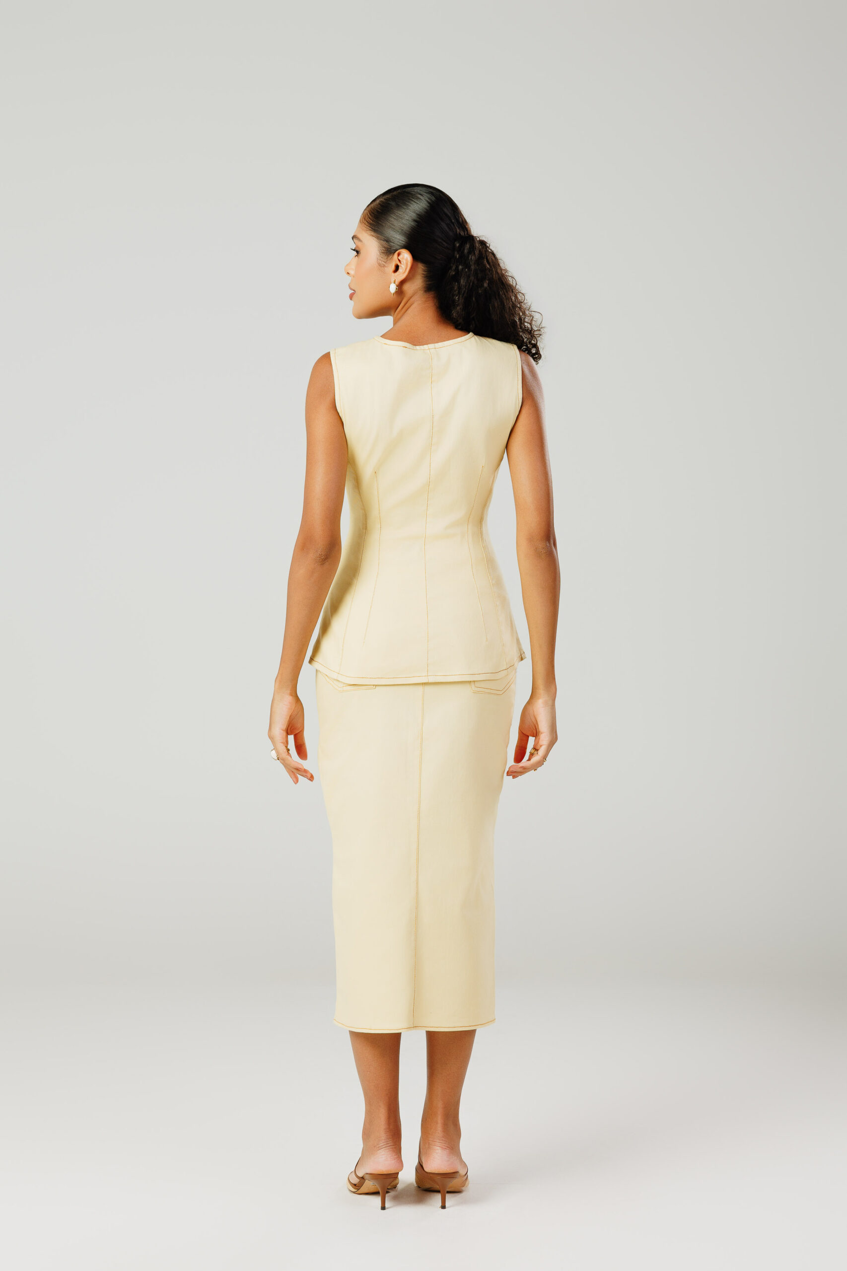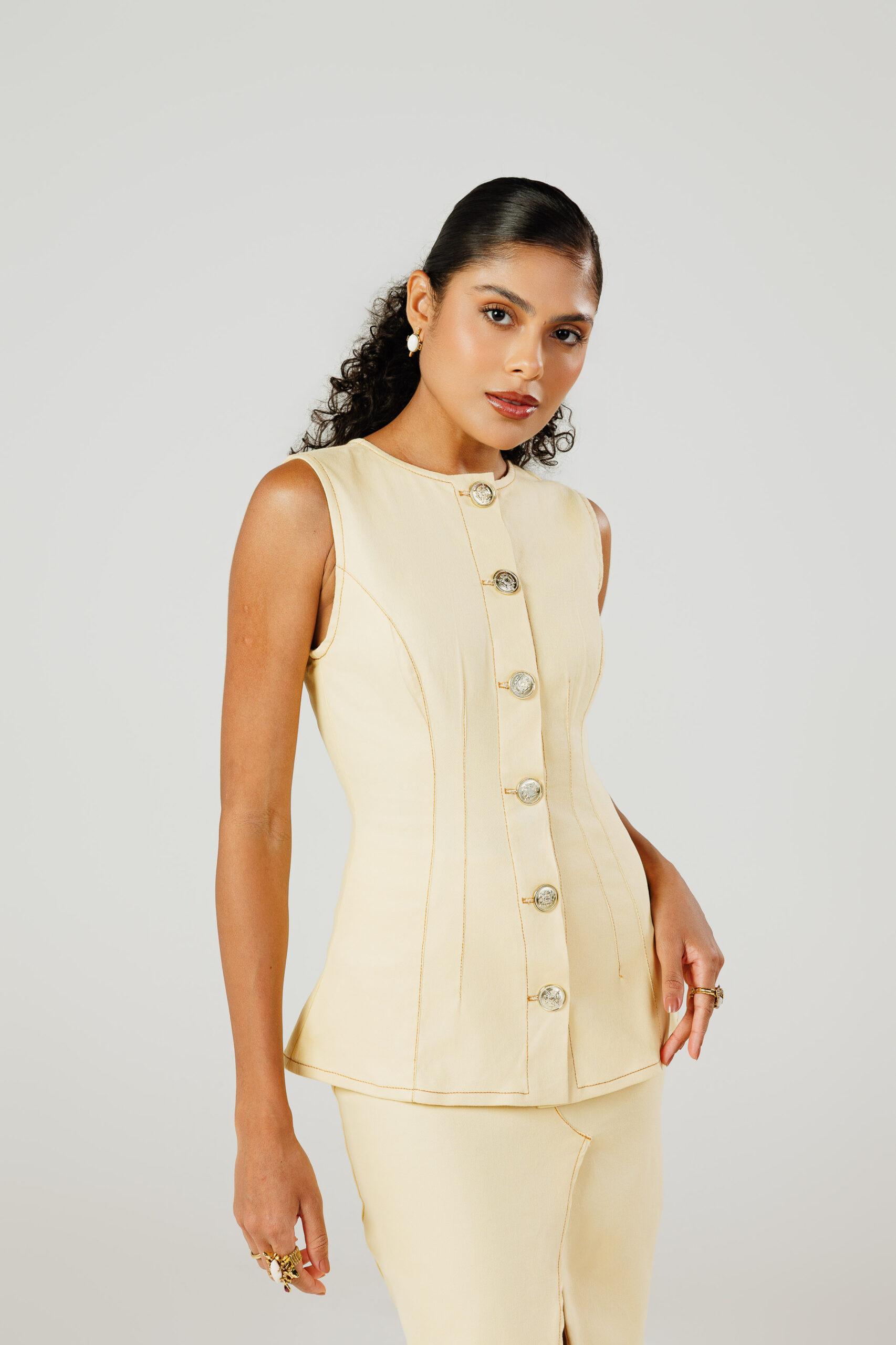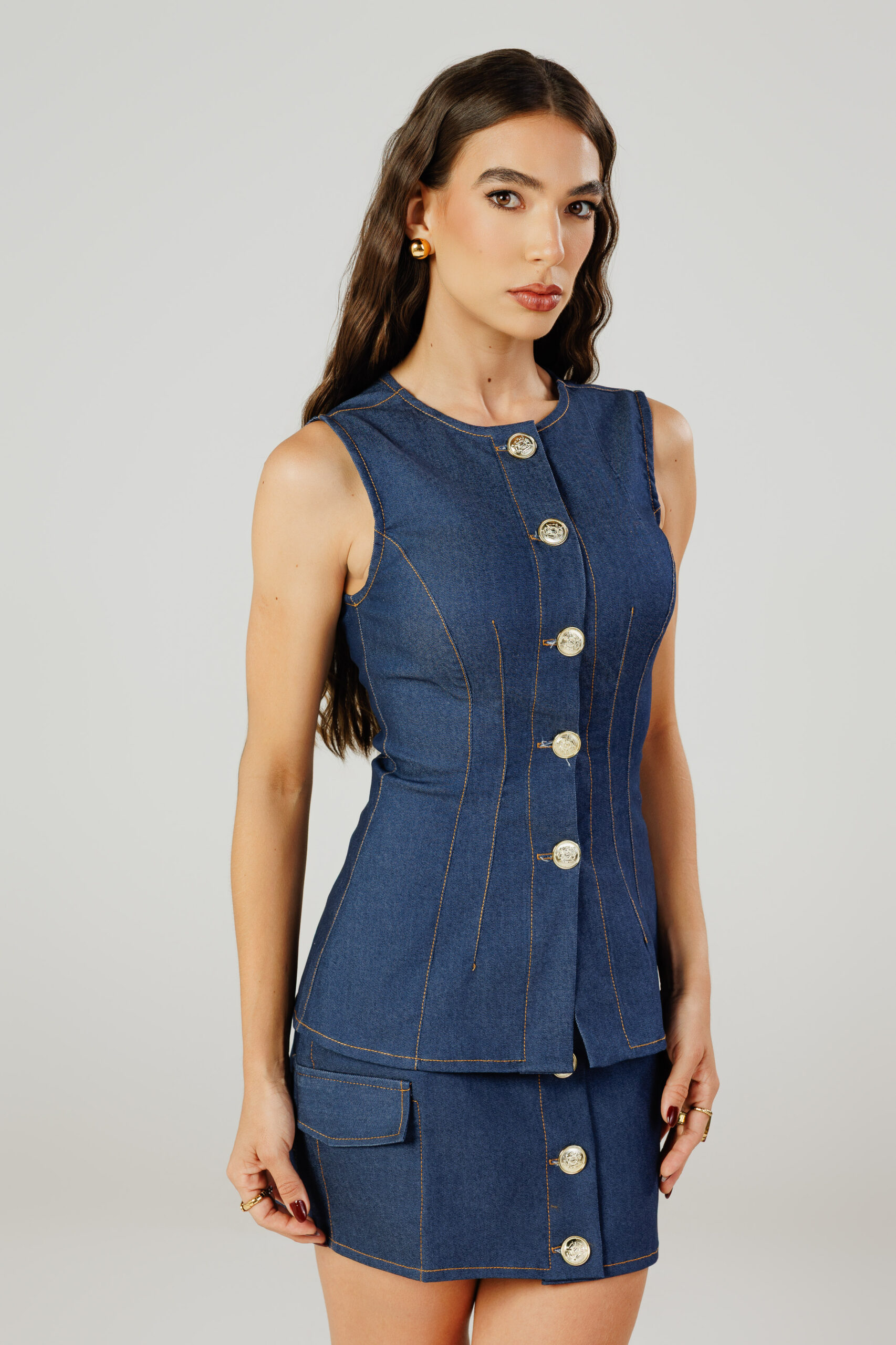 COLETE BOTÕES HELENA, acinturado, com abotoamento frontal em botões de metal. Estruturado por recortes com pespontos contrastantes. Confeccionado em sarja leve de algodão com elastano.