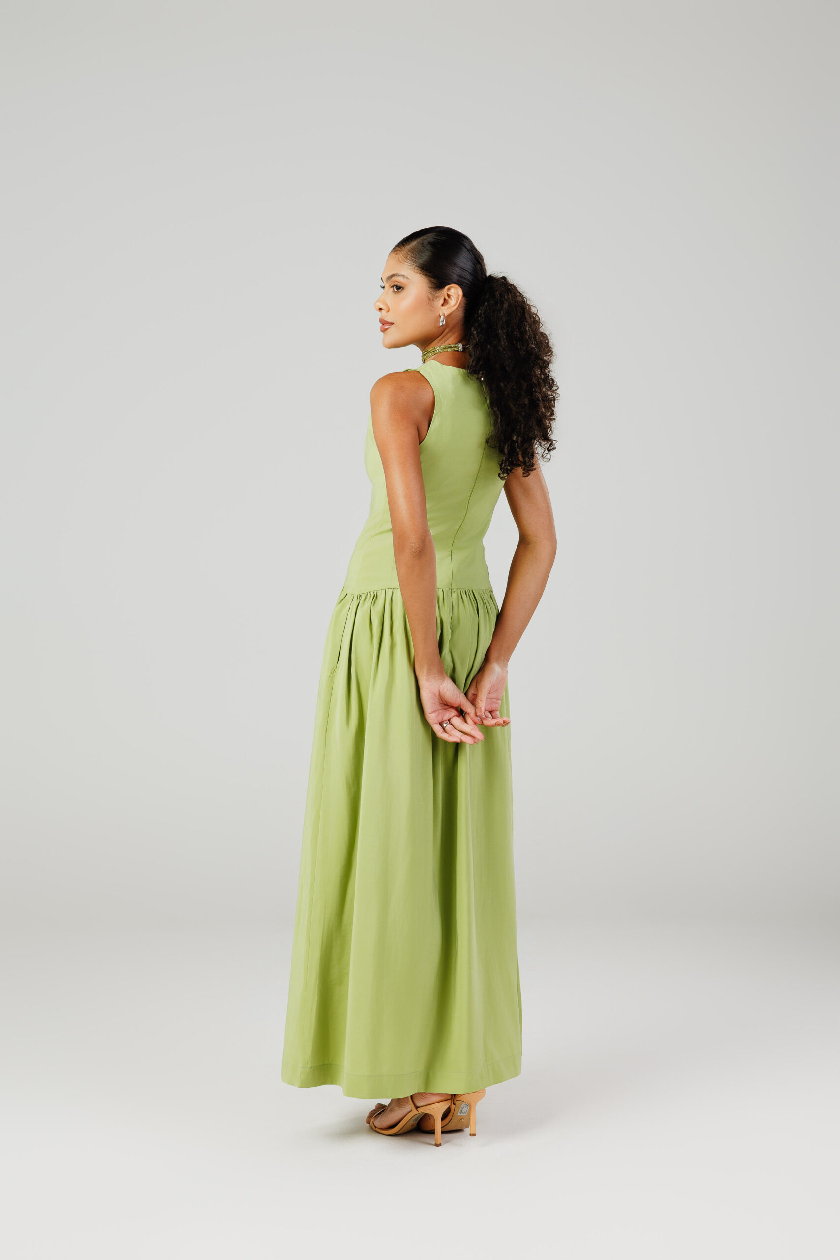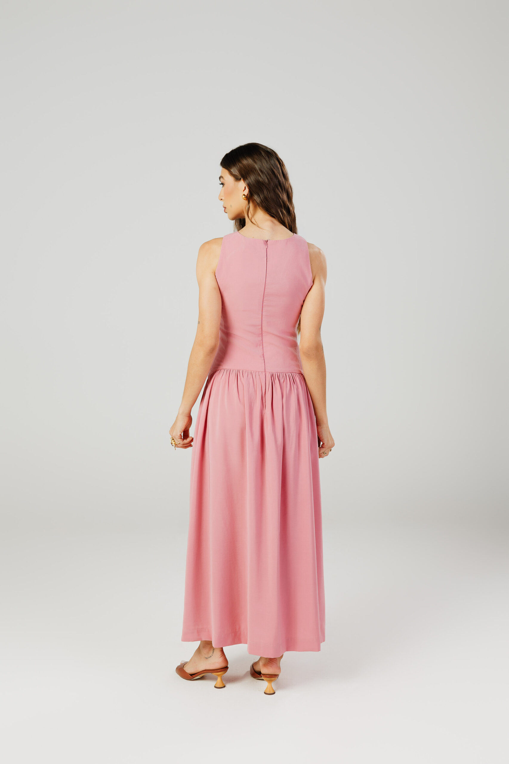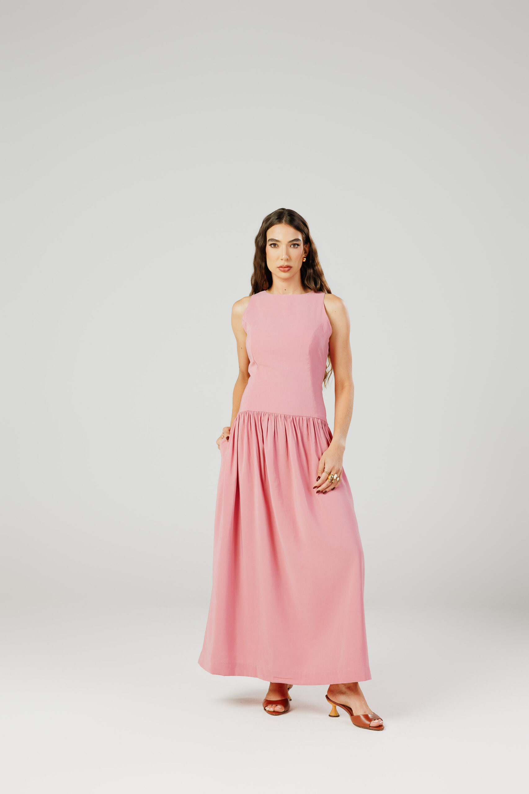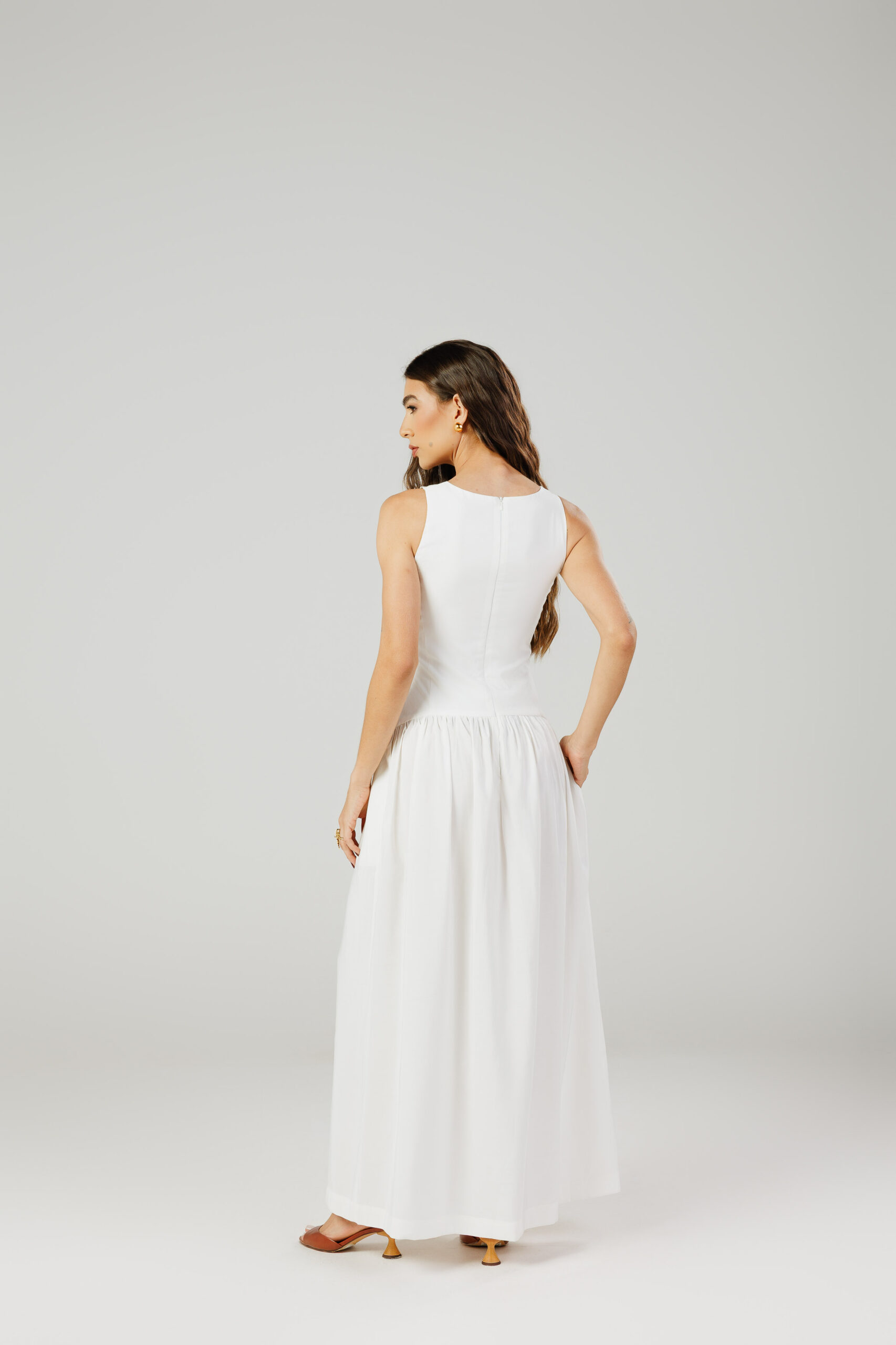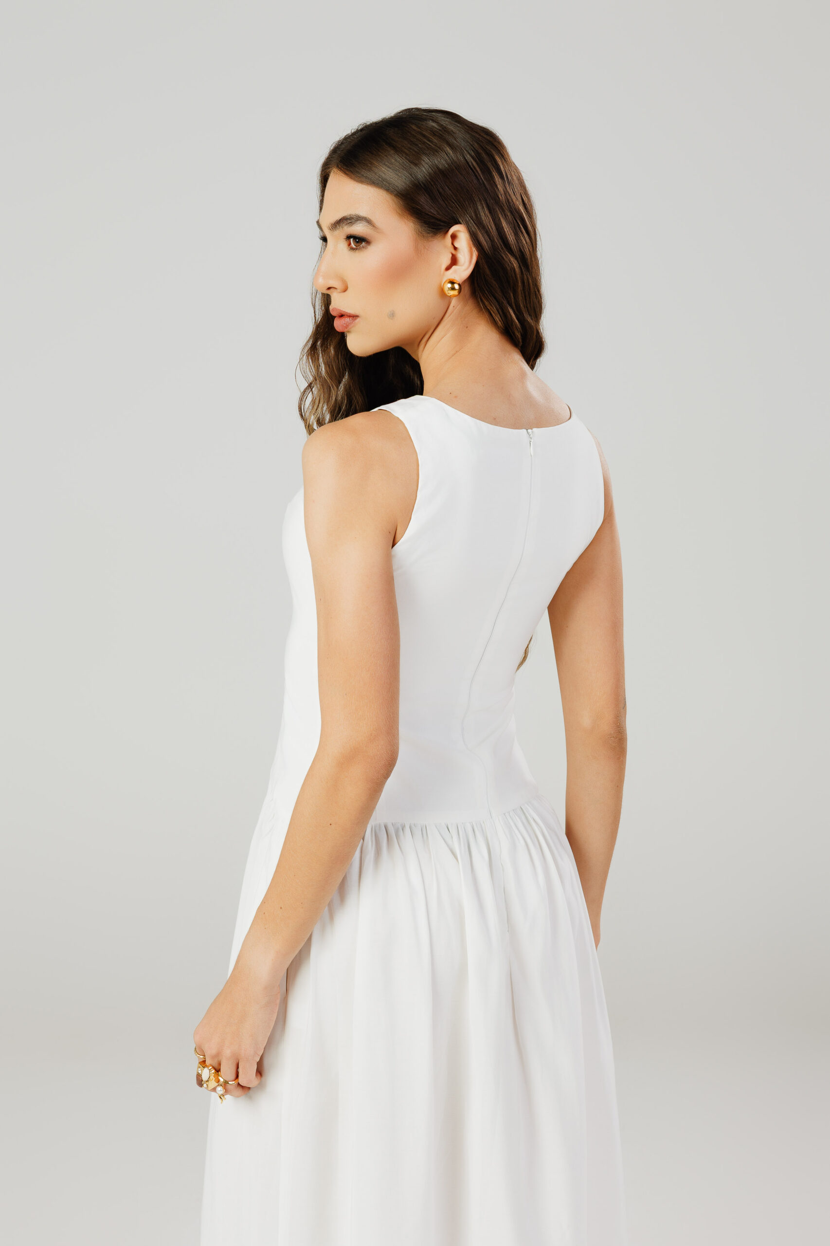 O modelo apresenta corpo levemente ajustado, valorizando a silhueta de forma elegante, e saia midi ampla com franzido, que proporciona movimento e fluidez. O decote fechado e as cavas bem estruturadas conferem um visual moderno e refinado, ideal para diferentes ocasiões.