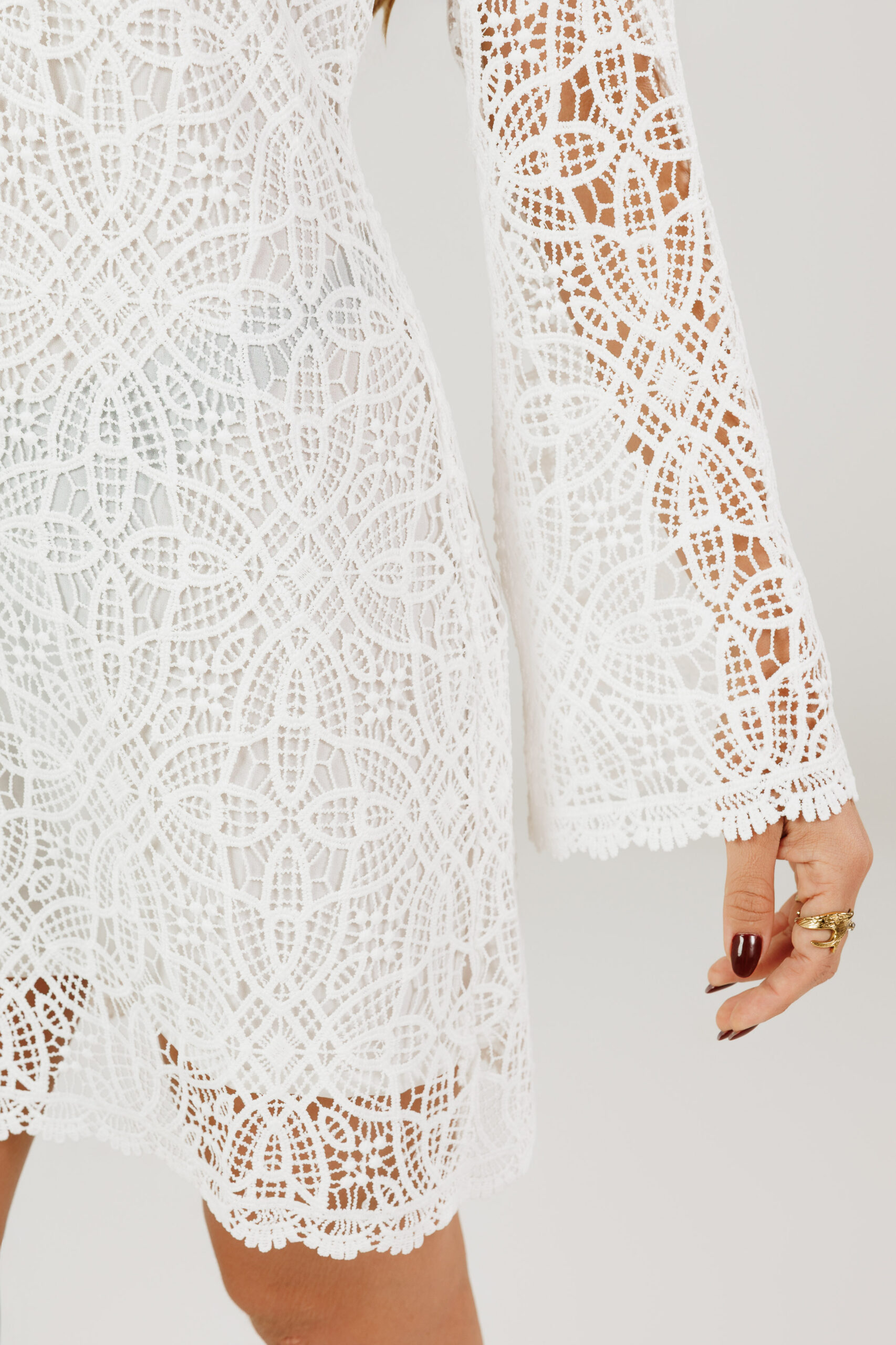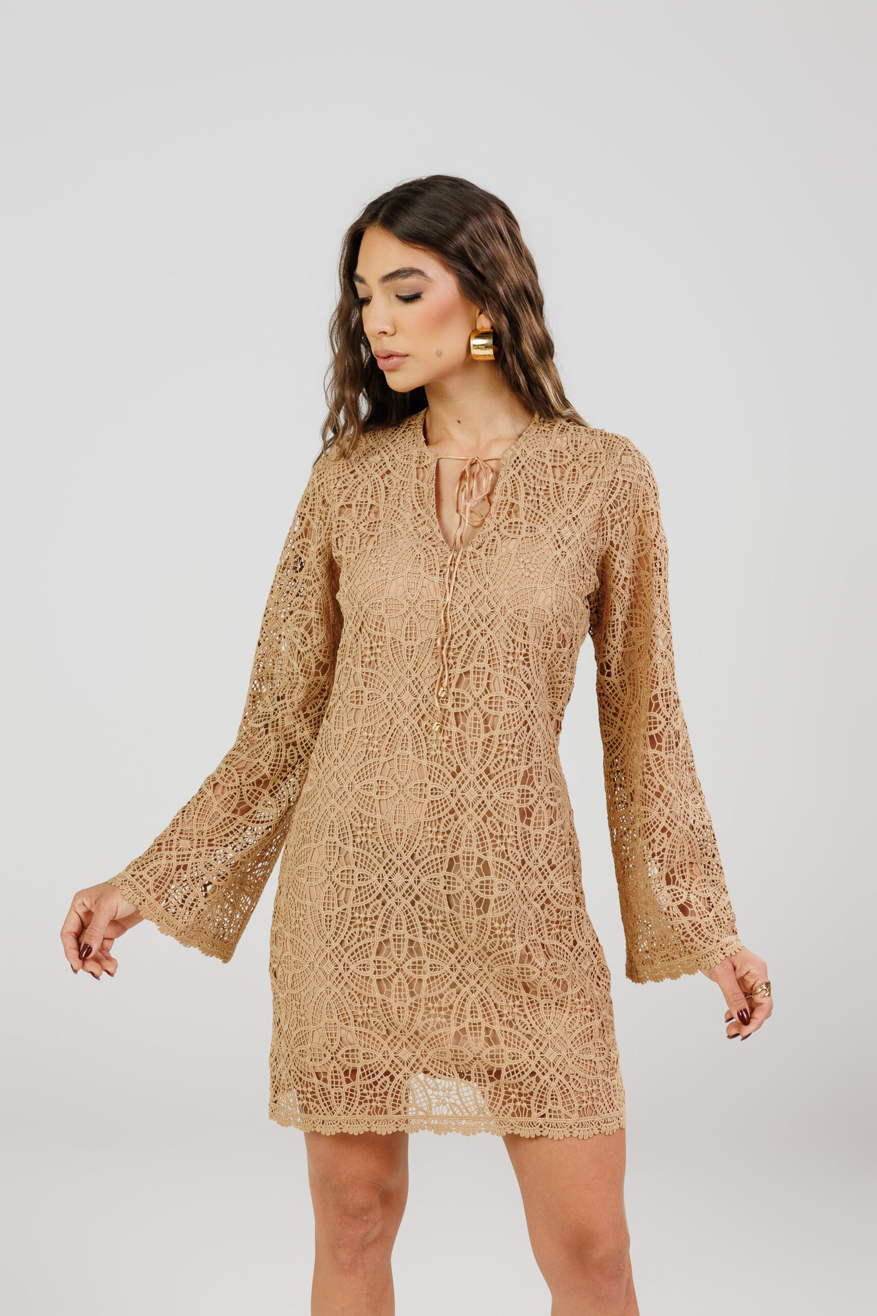 Apresenta modelagem reta, com mangas longas levemente amplas, que adicionam fluidez e elegância à peça. O decote em V com amarração delicada valoriza o colo de forma sutil, enquanto o acabamento rendado na barra e nas mangas reforça o acabamento refinado. O comprimento curto equilibra feminilidade e sofisticação, tornando o vestido ideal para diversas ocasiões.